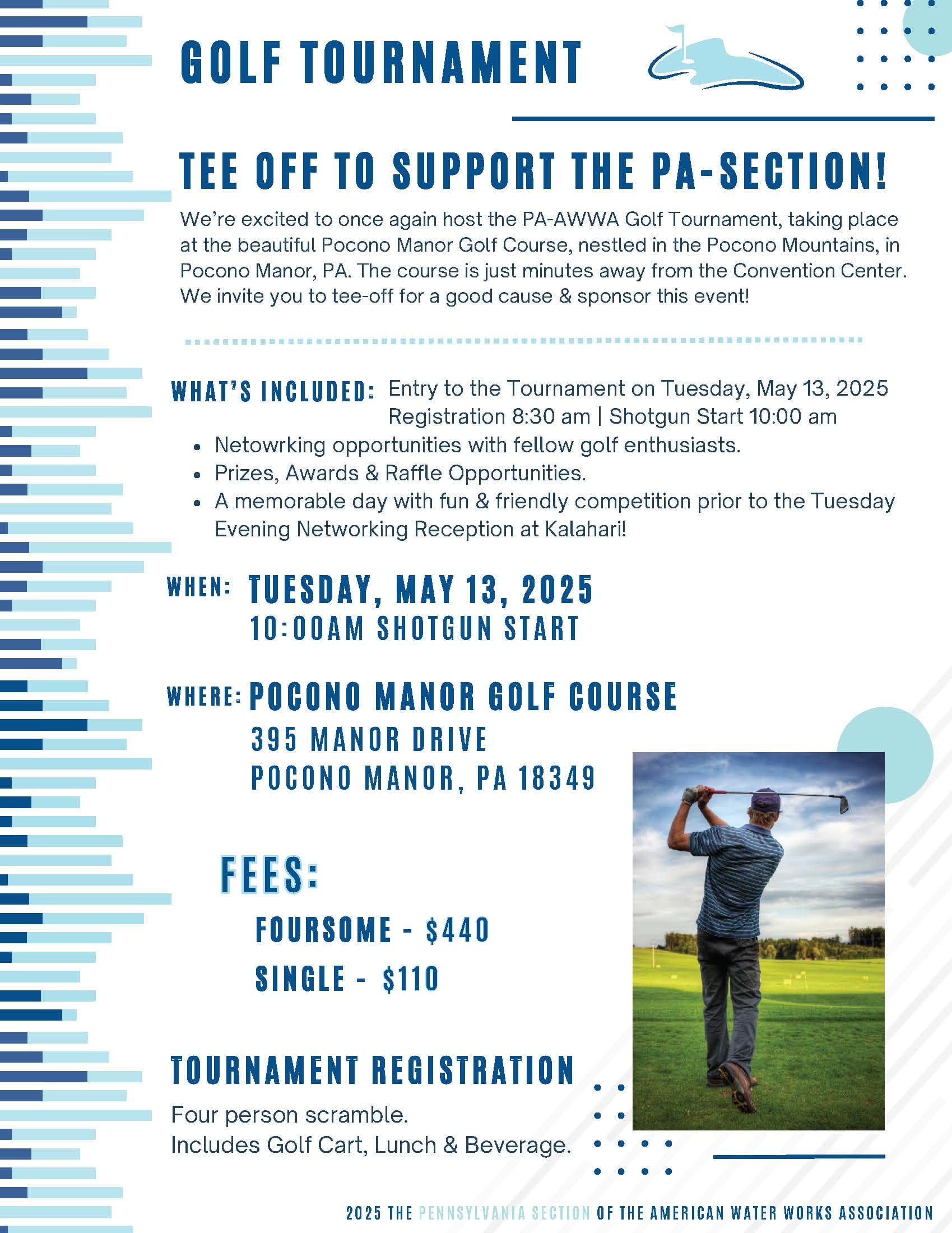 We’re excited to once again host the PA-AWWA Golf Tournament, taking place at the beautiful Pocono Manor Golf Course, nestled in the Pocono Mountains, in Pocono Manor, PA. The course is just minutes away from the Convention Center. We invite you to tee-off for a good cause & sponsor this event!